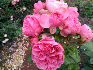 Насыщенно-розовые, густо махровые цветки шаровидной формы как бы светятся